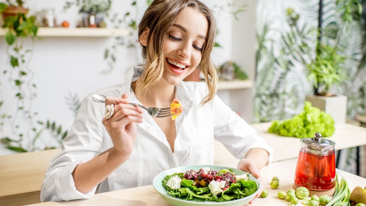 If you overfill your plate, digestion slows. Aim for moderate portion sizes. Eat until 80% full.