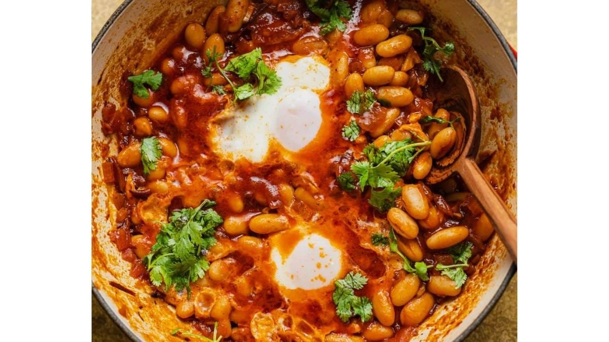 Simmer beans in a smoky tomato sauce. Crack eggs into the mixture. Let them poach right in the sauce. Scoop it all into a bowl.