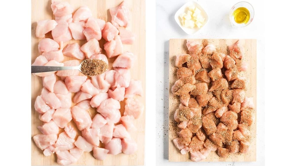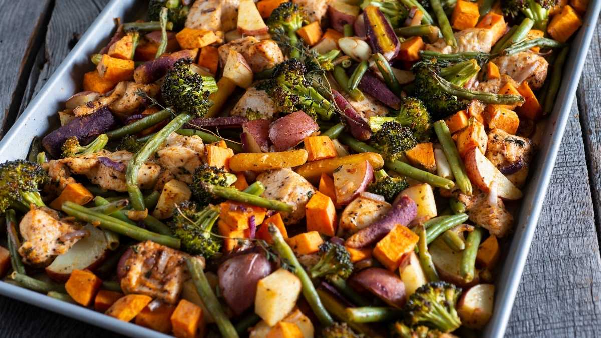 How to prep: Cut chicken into bite-sized pieces. Chop vegetables into similar sizes so they cook evenly. Toss everything with oil and seasonings. Spread on a baking sheet and roast at 400°F for 25 minutes.