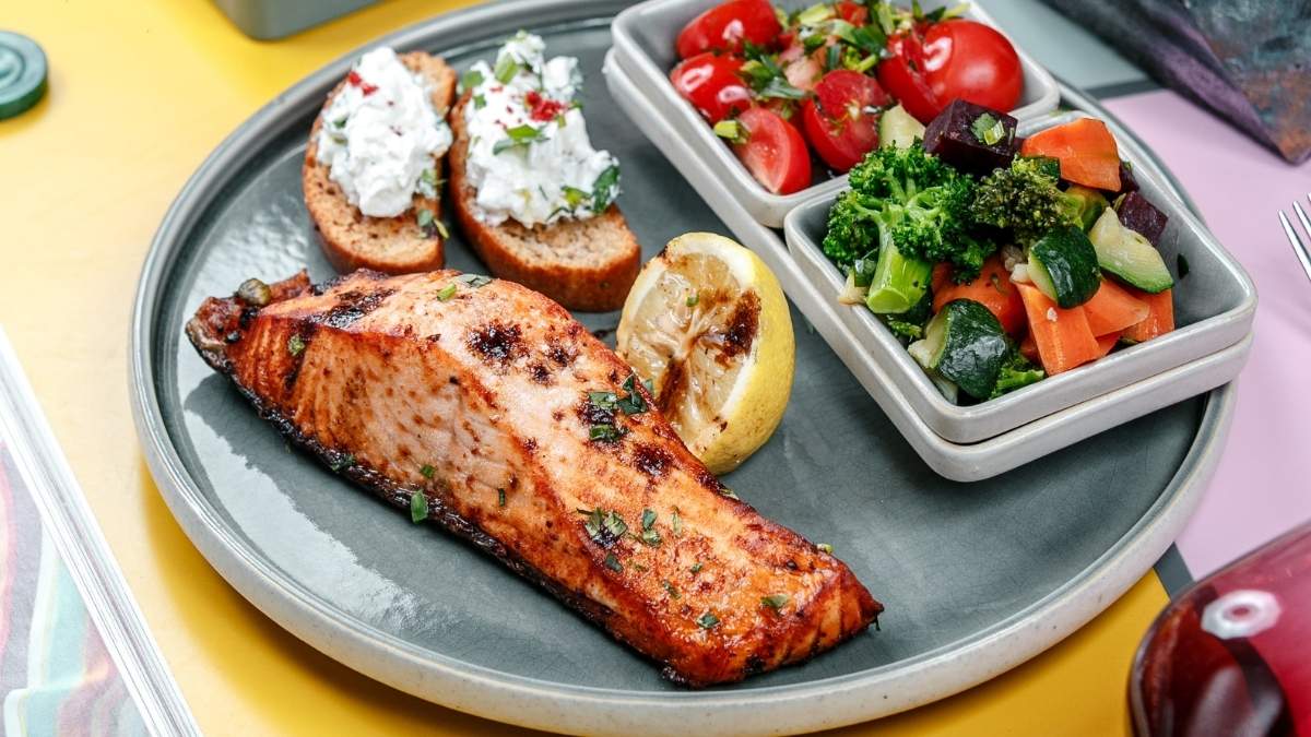 - Dinner: Baked salmon + steamed broccoli + quinoa.