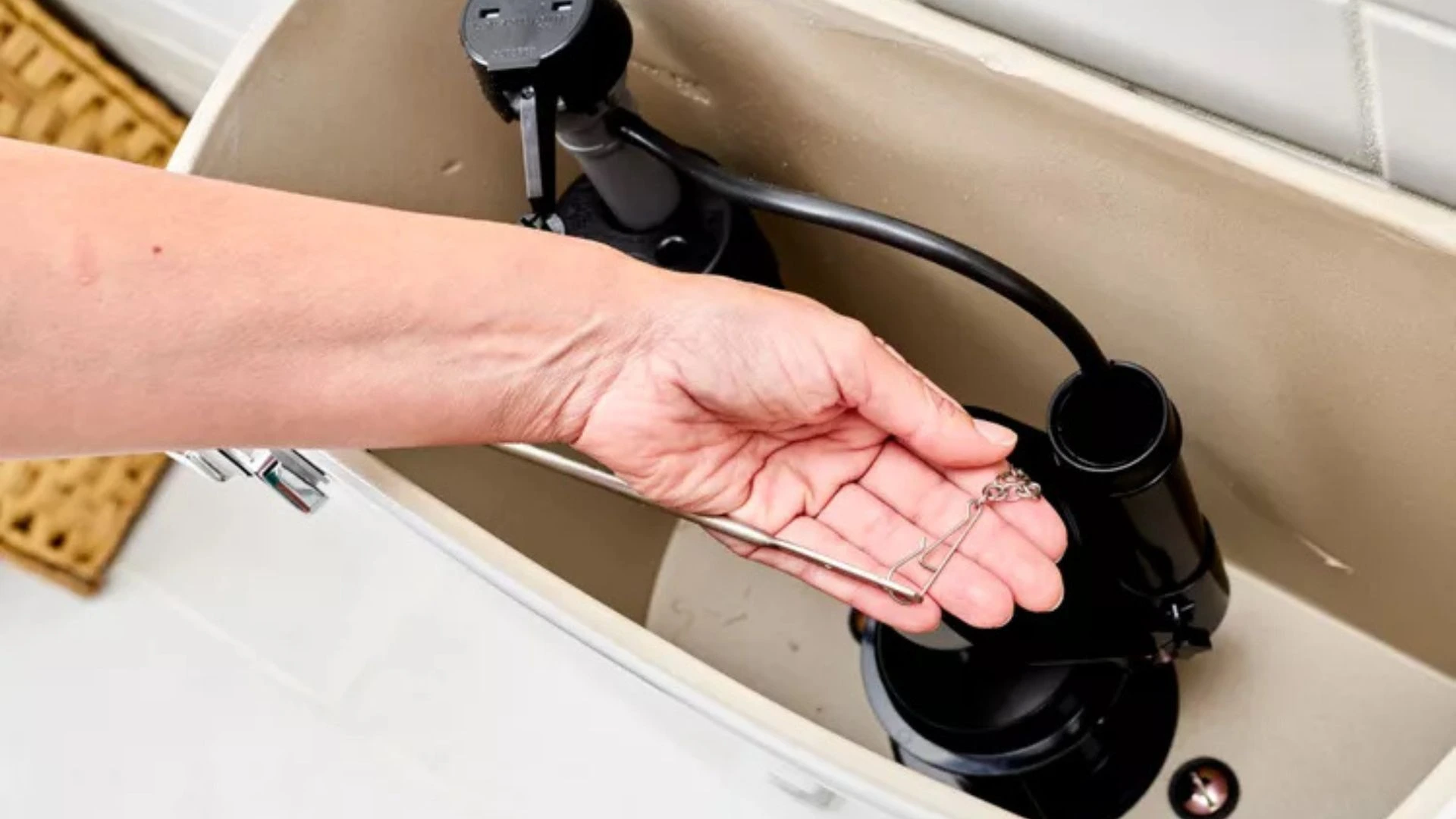 Take the old flapper to Home Depot so you get the right size—they come in 2-inch and 3-inch sizes. Install the new one by hooking it to the same spots. Adjust the chain so it has just a tiny bit of slack. Too tight and the toilet keeps running. Too loose and it won’t flush right.