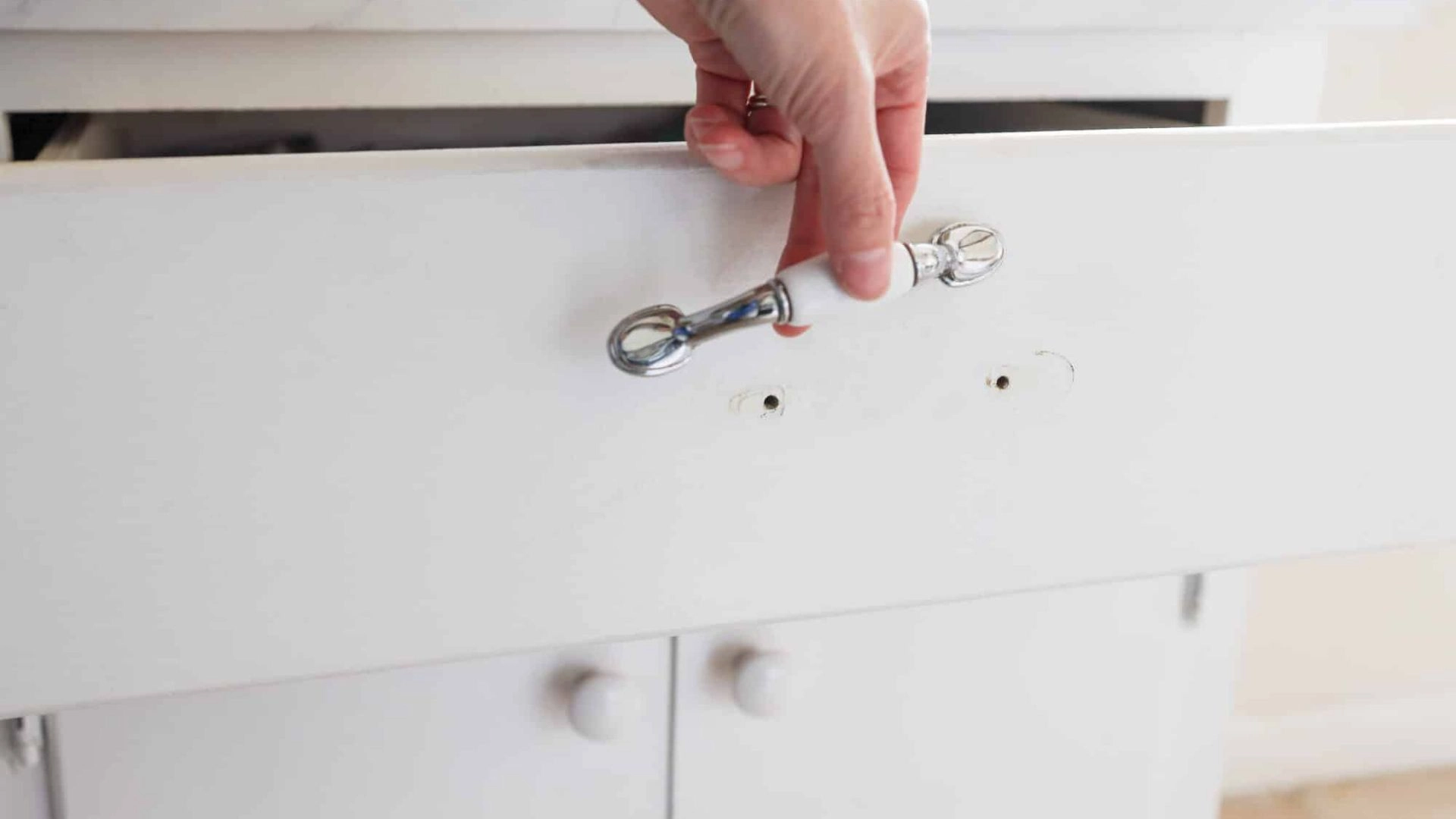Use painter’s tape as a guide to keep placement consistent. If you drill new holes, drill from the front side to prevent ugly tear-out on the back.