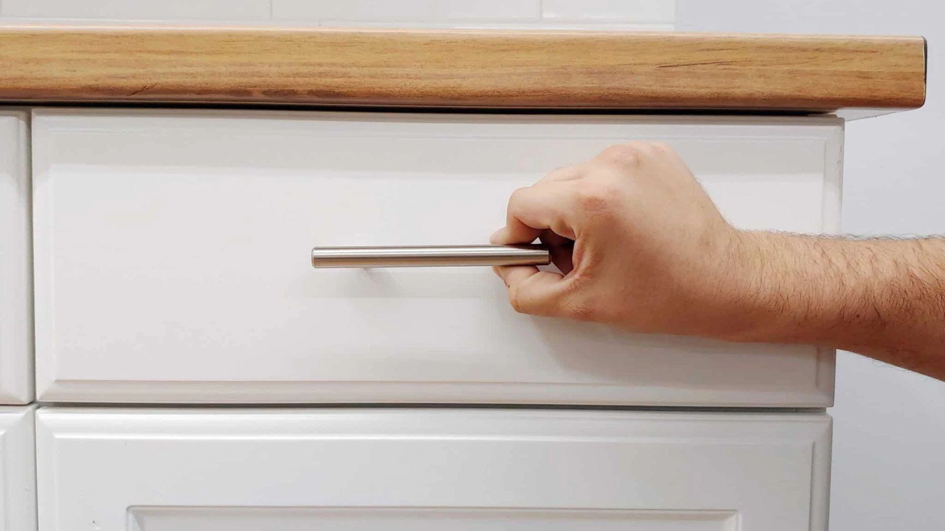 Amazon sells 25-packs of modern handles for $35-50. That’s enough for most kitchens at a fraction of what you’d pay hiring someone.