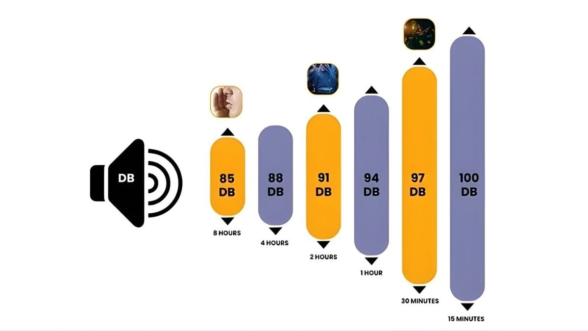 don’t expose yourself to sounds louder than 85 dB for more than 8 hours. That’s roughly the noise level of heavy traffic. A concert can hit 110 dB. A lawnmower sits around 90 dB.