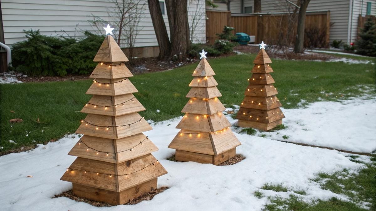 Ditch the plastic and go rustic. Stack progressively smaller pieces of wood to create tree shapes in your yard. You can build these yourself or buy pre-made versions. Wrap them with simple white lights. The natural wood texture looks stunning against snow or green grass. This trend fits the whole sustainable, organic aesthetic people love right now.