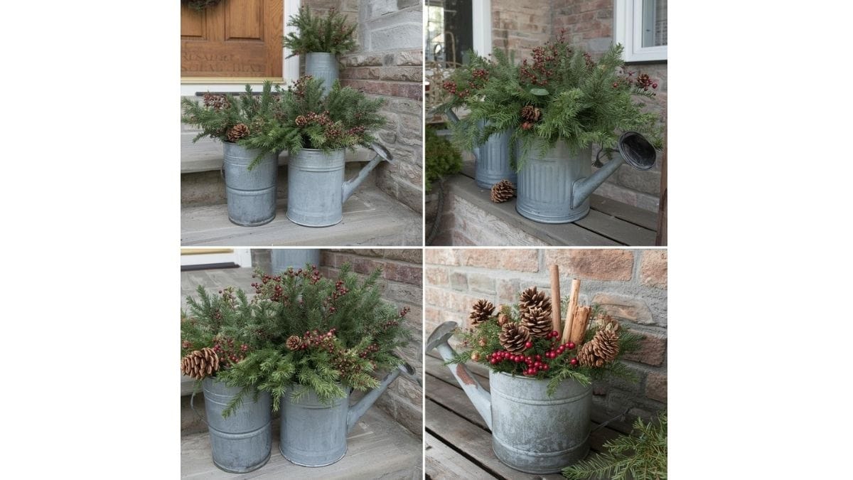 Grab some galvanized buckets, tubs, or watering cans. Fill them with fresh or artificial evergreen branches. Tuck in some berries, pine cones, and cinnamon sticks. Position these containers on porch steps, near your door, or on a patio table. The metal finish looks farmhouse-chic. Plus, you can use these containers for other seasons too.