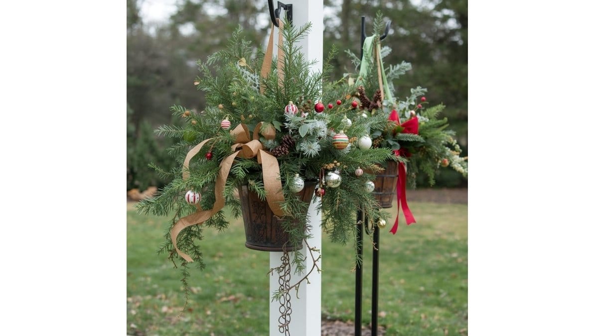 Don’t forget your hanging baskets. Swap out summer flowers for winter greenery arrangements. Mix different types of evergreens with trailing ivy or ribbon. Add small ornaments that catch the light. Hang them from porch hooks or shepherd’s hooks in your yard. These eye-level decorations make your space feel finished and thoughtful.