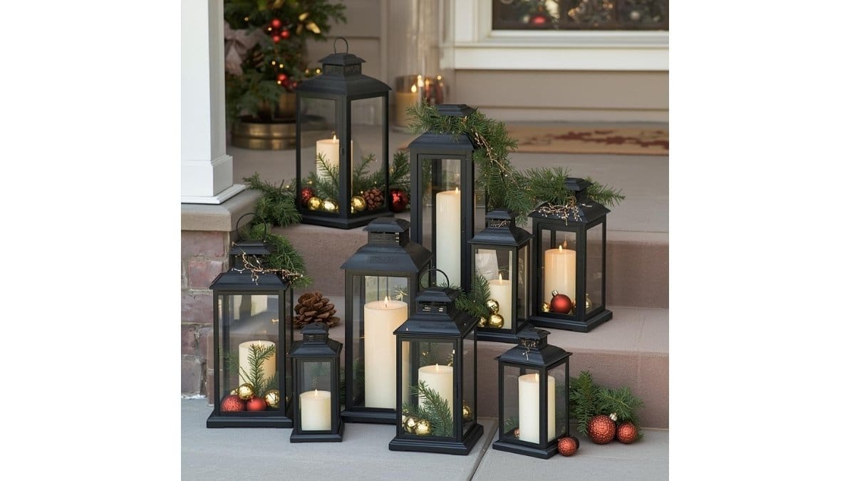 Cluster lanterns of different sizes on your porch floor or steps. Fill them with battery-operated candles, ornaments, or evergreen sprigs. You can find affordable lanterns in black metal or natural wood finishes. Group them in odd numbers—three or five looks best. This creates ambient lighting that feels sophisticated and warm. It’s like your porch is hugging visitors.