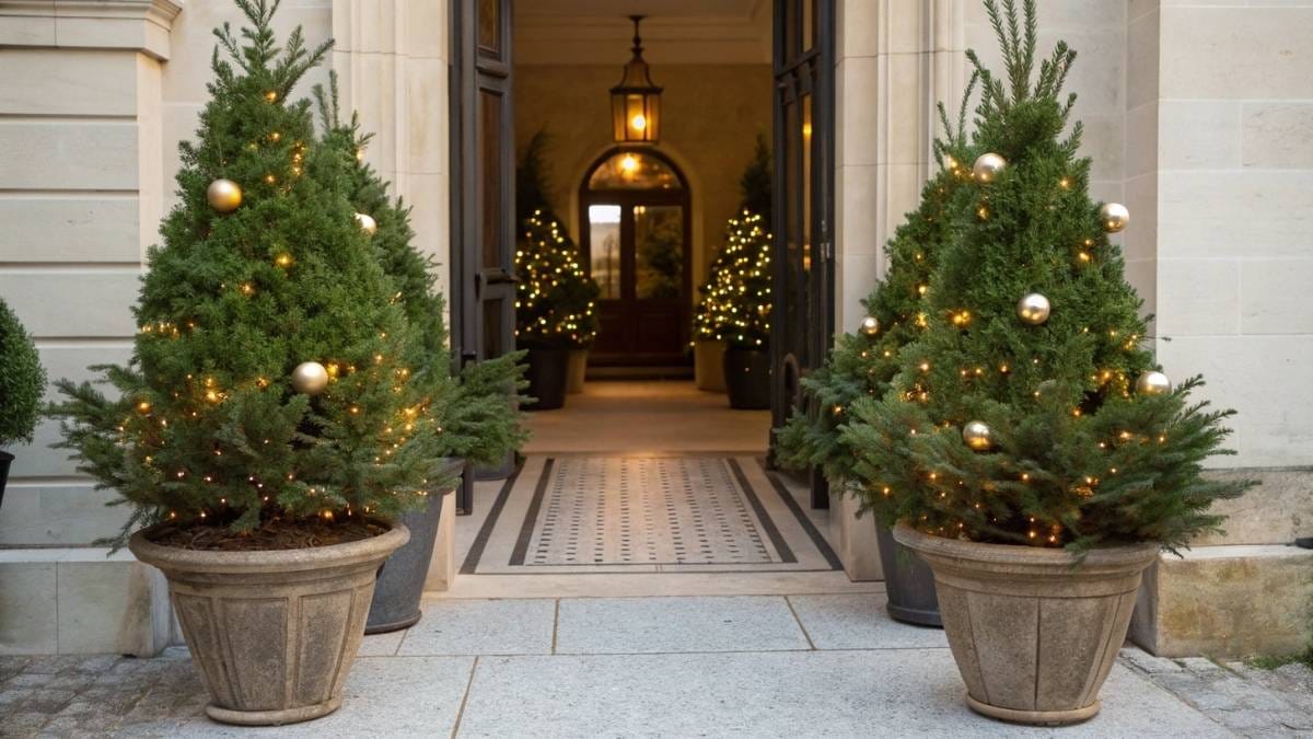 Place matching potted evergreens on each side of your entrance. Decorate them with small ornaments and lights. This symmetrical look never goes out of style. But 2025 is all about using real or realistic-looking artificial trees in natural fiber pots. Add some birch branches or curly willow for height. Wrap the pots in burlap or plaid fabric. The whole setup feels fresh and organic.