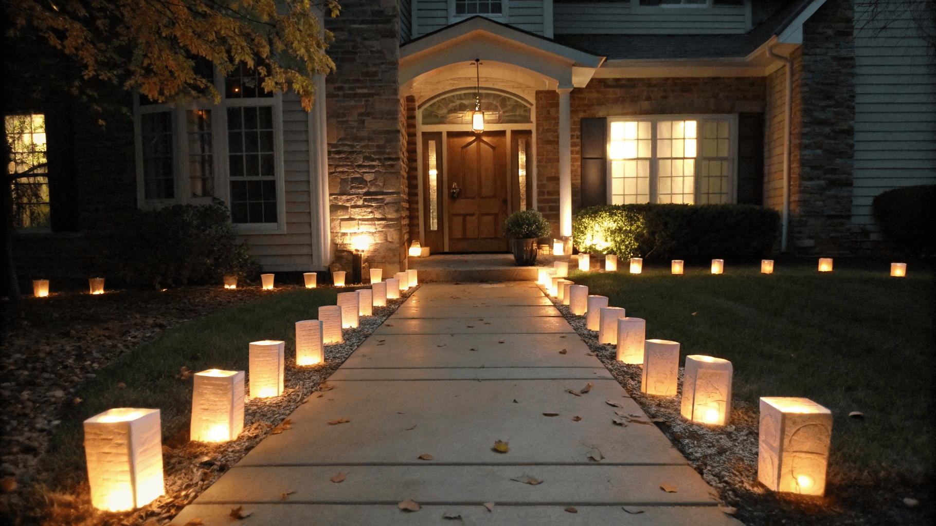 Create a glowing walkway to your front door. Use paper bag luminarias with LED candles inside. Or upgrade to weather-proof lanterns with battery-operated lights. Line both sides of your path or driveway. This look is simple but incredibly effective. Guests feel welcomed before they even reach your door. You can also fill clear bags with fake snow and add colored lights for a modern twist.