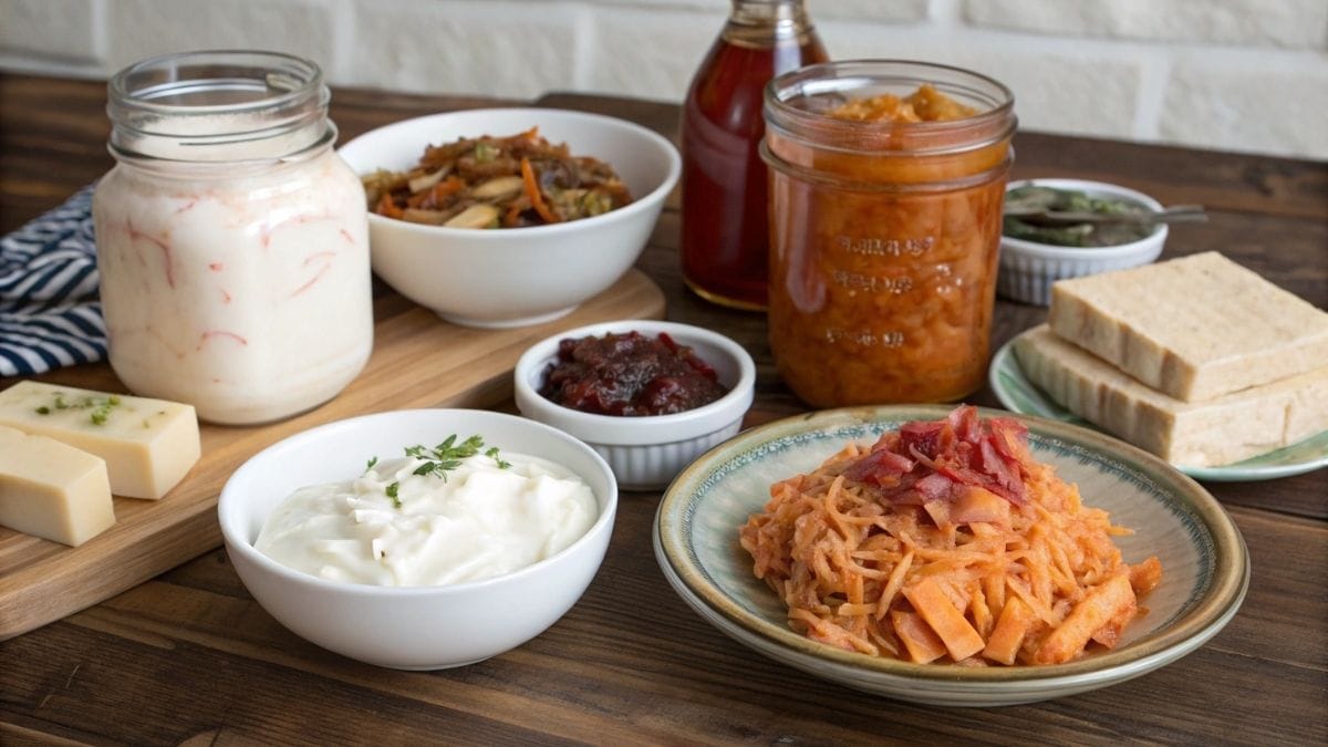 Probiotic foods add helpful bacteria. Yogurt with live cultures, kefir, kimchi, sauerkraut, kombucha, miso, and tempeh are smart choices.