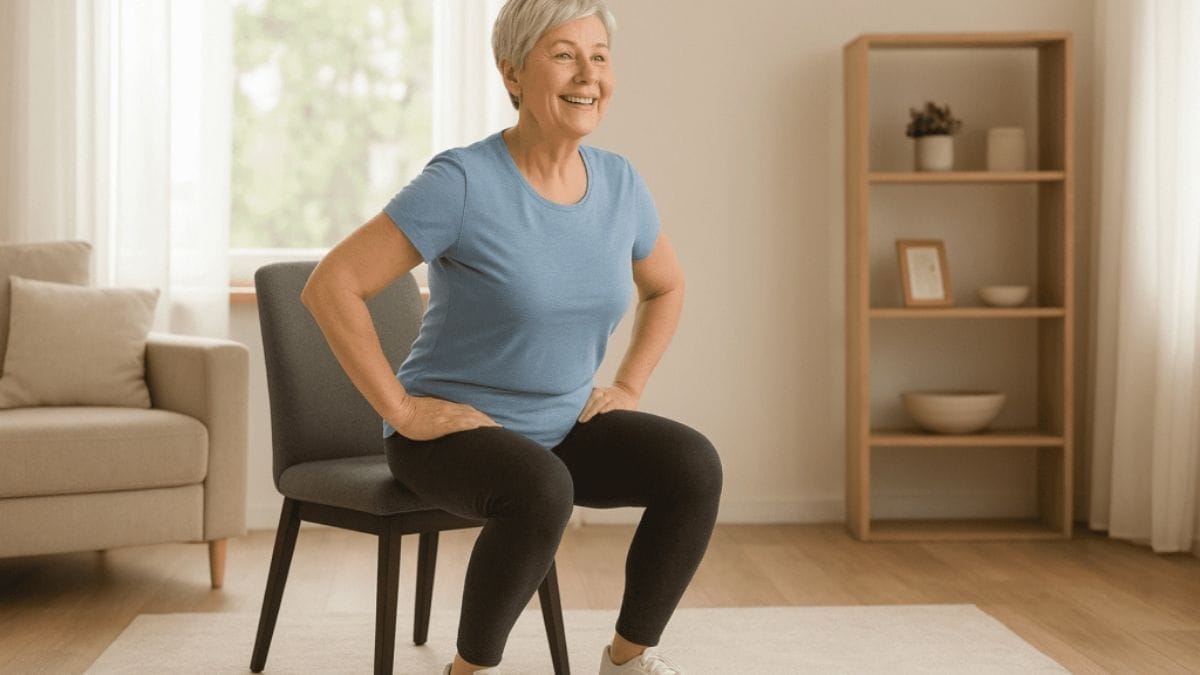 The chair stand is one of the most functional exercises you can do. It directly trains the muscles you use to stand up, sit down, go up stairs, and push off the ground while walking.