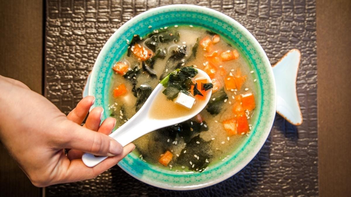 Miso is fermented soy paste that tastes savory and salty. It’s full of probiotics that help your gut health. Traditional Okinawan breakfast includes a bowl of miso soup with tofu cubes and seaweed floating in it.